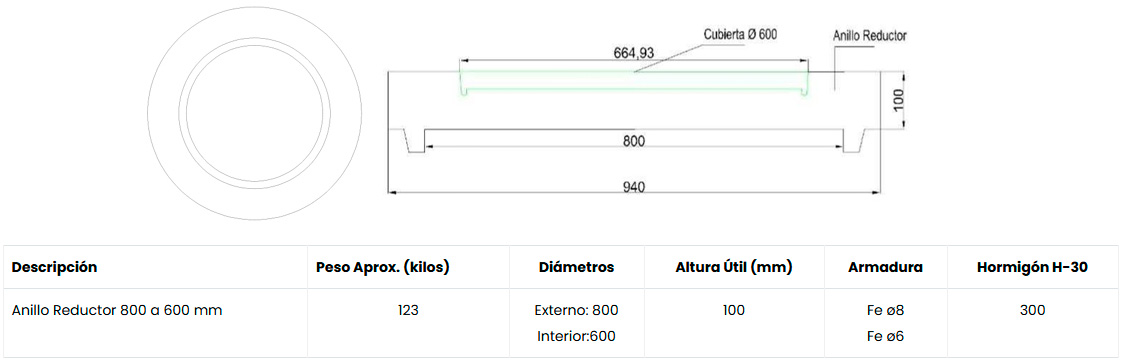 Elemento prefabricado diseñado para el uso de cámaras de inspección domiciliarias, este se coloca sobre un módulo de ø 800 y sobre ella se puede colocar un módulo de 600 con altura variable o directamente una cubierta de ø 600.